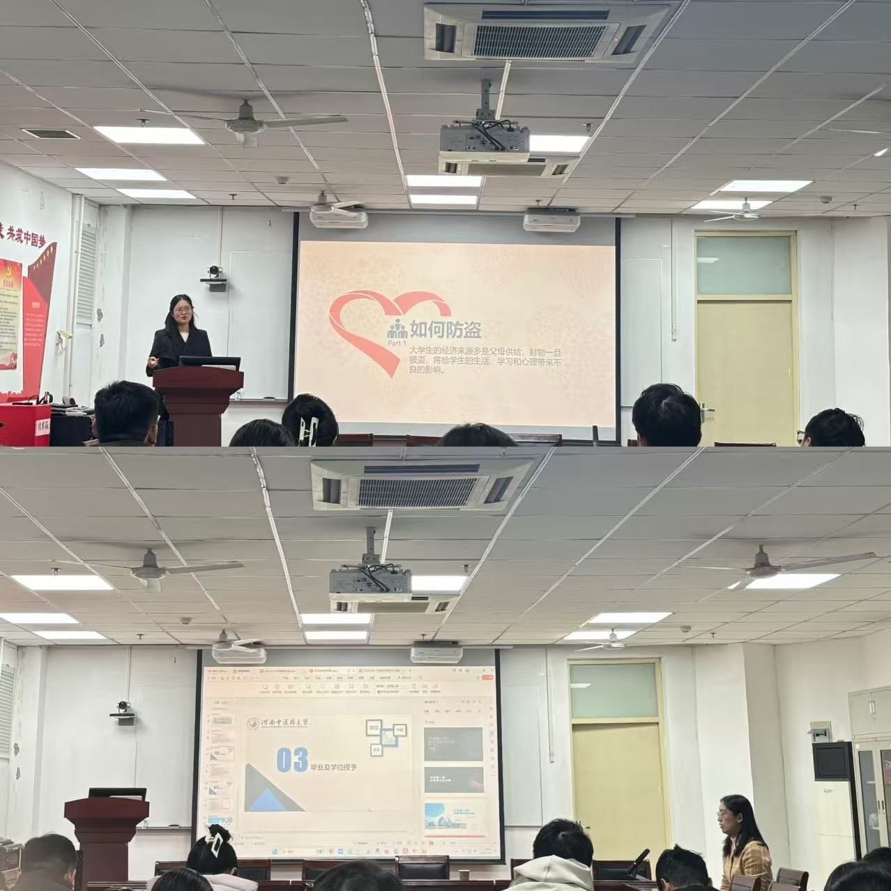 针对研究生群体的特殊需求,段胜男结合高校常见安全事故案例,从宿舍管理、交通安全、网络信息安全及心理健康等方面展开安全警示教育。她通过情景模拟与数据分析,生动诠释了"安全无小事"的管理理念,要求学生建立主动预防意识,将安全防护措施融入日常学习生活的每个细节。