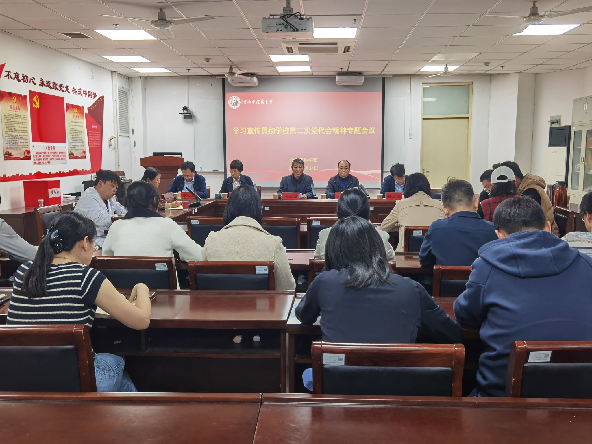 会上,执行院长、副书记冯素香传达了学校第二次党代会精神,并领学了校党委书记李小芳所作的题为《守正创新 奋勇争先 为加快建设特色鲜明的一流中医药大学而团结奋斗》工作报告。第二次党代会代表、仲景实验室党支部书记白明同志,结合自身工作实际交流了参会体会,表示要主动融入学校事业高质量发展的新征程中,用会议精神指导工作实践,以工作实绩检验学习成效,为学校开启特色鲜明的一流研究型大学建设做出应有贡献。