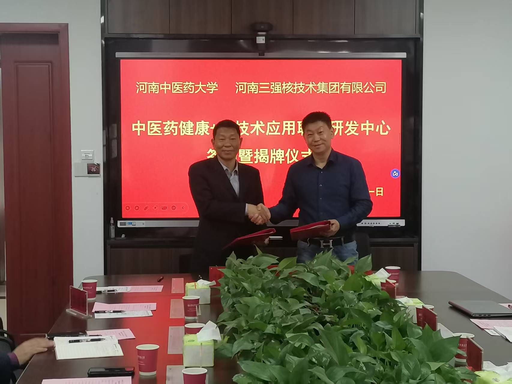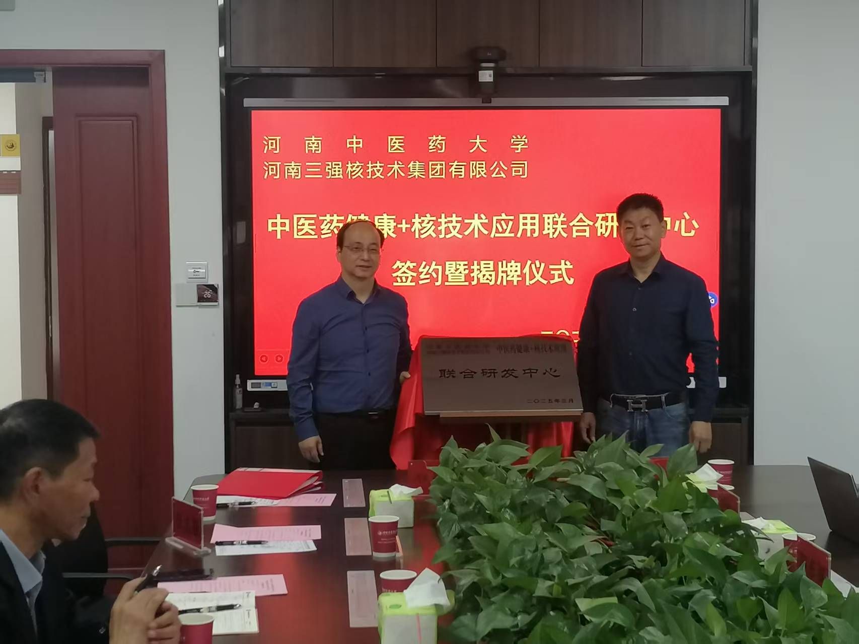 在与会人员的共同见证下,张振强与朱军签署了共建“河南中医药大学●河南三强核技术集团有限公司中医药健康+核技术应用联合研发中心”合作协议,李东阳与朱军共同为校企联合研发中心揭牌。双方围绕下一步的科研合作方向如中药材质量提质增效、核医学装备研发等进行了座谈交流。朱军一行还参观了学校中医药博物馆和豫药全产业链河南省协同创新中心等。