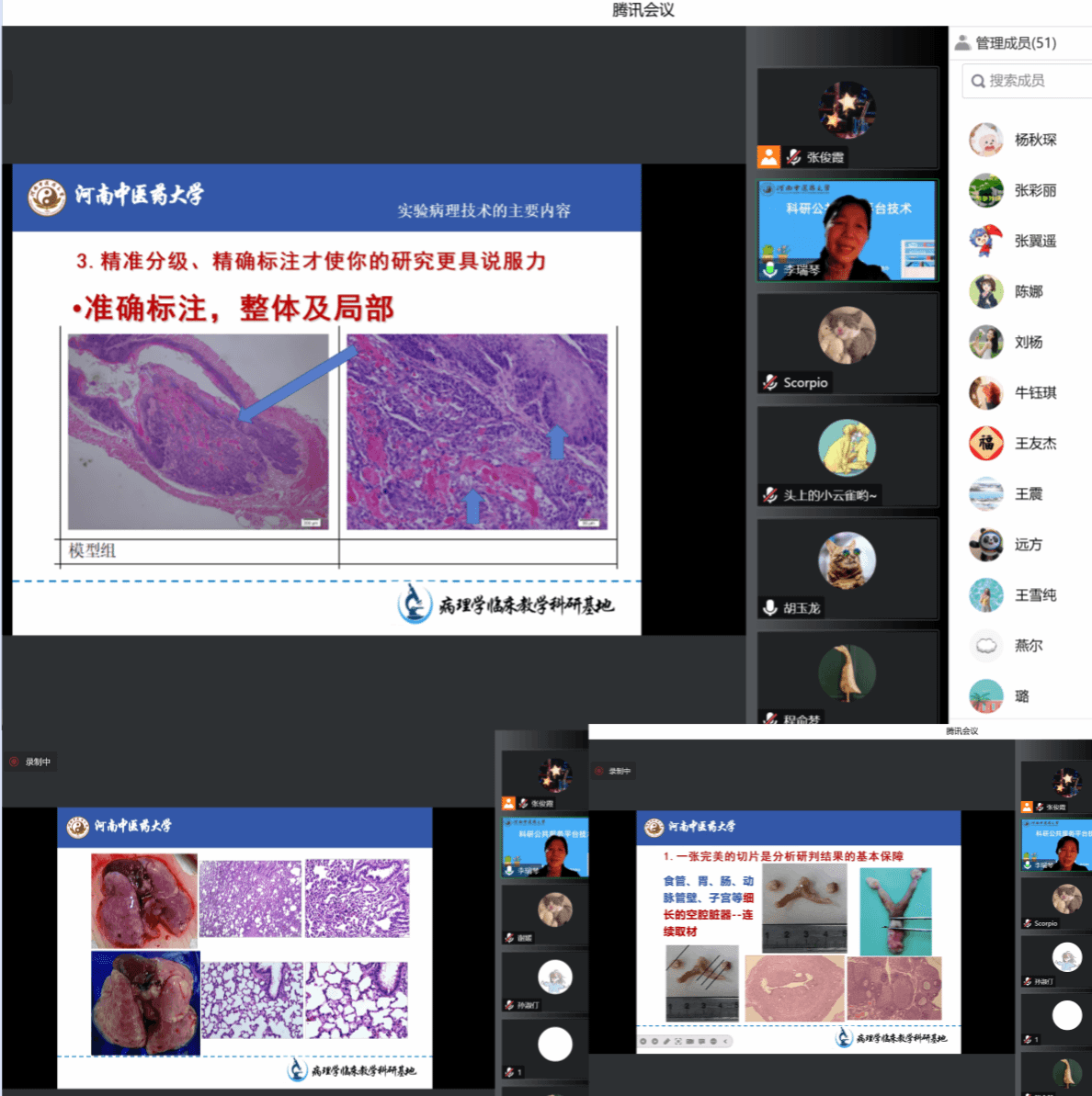 宣讲中,李瑞琴首先介绍了常见实验动物组织的取材前准备及取材要点,其次详细讲解了不同器官的取材及研判分析。最后,李瑞琴总结了影响病理实验室结果的各类因素。在互动环节中,李瑞琴就大家提出的脂肪肝、糖尿病肾病以及神经系统的取材要点等问题做出专业解答。整个宣讲现场技术干货满满,李瑞琴用大量生动详实的临床及科研病理学实例,让所有参会师生收获颇丰。