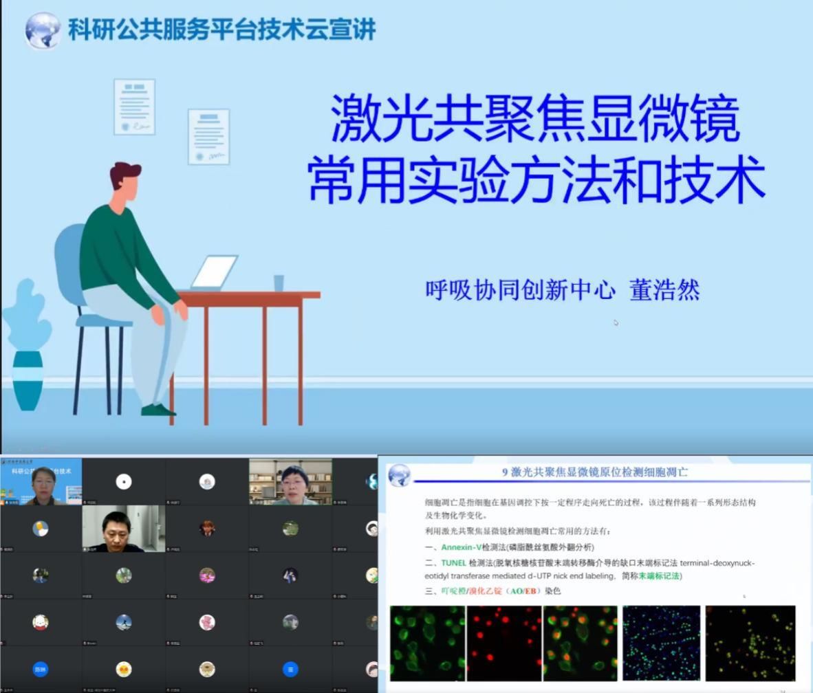首期宣讲由科学院院直党支部书记张俊霞主持,冯素香副院长致开幕辞,董浩然围绕《常用激光共聚焦显微镜应用技术及方法》从激光共聚焦显微镜的常用检测技术以及检测注意事项开展了深入浅出的技术宣讲,整个宣讲过程110名师生全程在线。宣讲最后,董浩然对大家在共聚焦制样方面的问题做出详尽解答,获得师生一致好评。