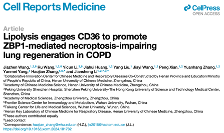 本网讯(文图/王嘉祯)2024年9月9日,呼吸疾病中医药防治省部共建协同创新中心李建生教授团队在Cell子刊Cell Reports Medicine(中科院分区1区TOP,IF 11.7)发表题为“Lipolysis engages CD36 to promote ZBP1-mediated necroptosis-impairing lung regeneration in COPD”的研究论文,为慢性阻塞性肺疾病(COPD)肺再生缺陷机制提出新见解。