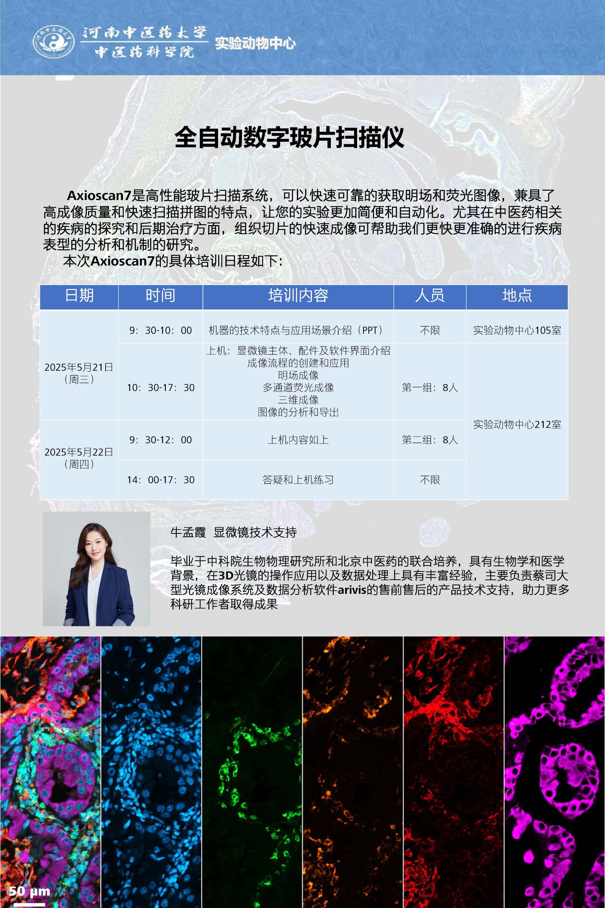 为此,实验动物中心特邀显微镜技术支持牛孟霞进行技术讲座及交流。会议时间:2025年5月21-22日(9:30-17:30),会议地点:实验动物中心。欢迎广大师生参与。