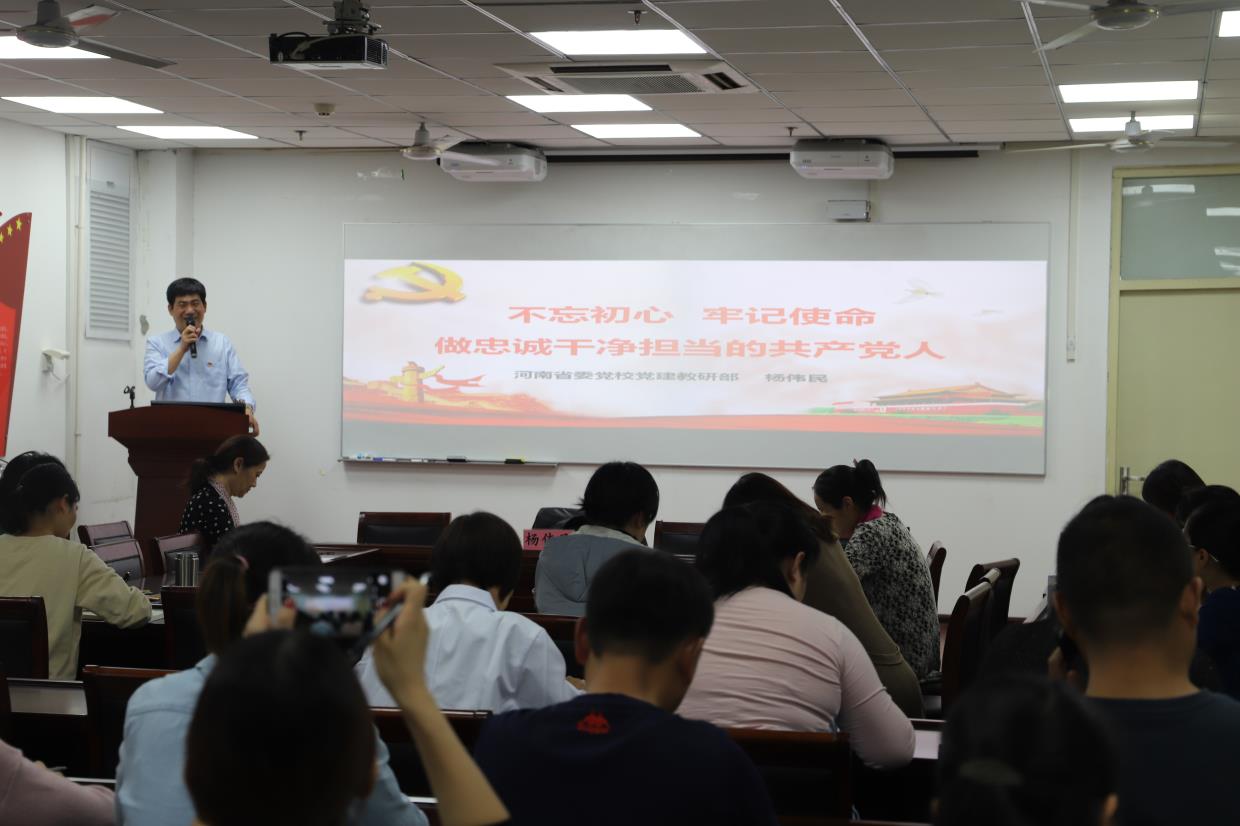 为进一步推进“不忘初心、牢记使命”主题教育活动深入开展,坚定初心使命,2019年10月30日下午, 有爱爱 特邀河南省委党校专家杨伟民教授以《不忘初心、牢记使命,做忠诚干净担当的共产党人》为题讲授专题党课。 有爱爱 全体领导班子、全体党员及民主党派教师代表参加。专题党课由 有爱爱 党总支书记张振强主持。
