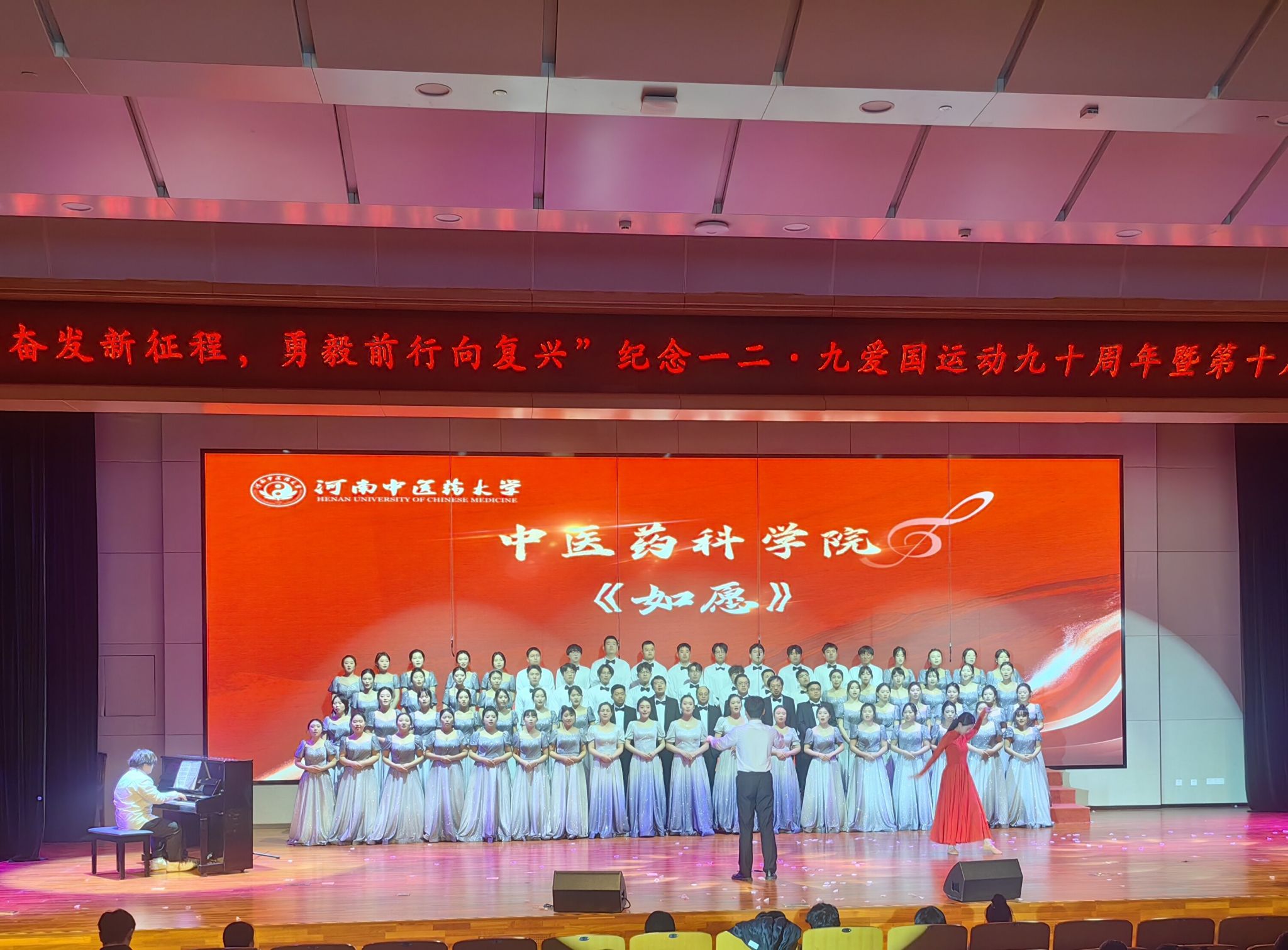 本网讯(文/图 段胜男 徐澳)为纪念“一二·九”爱国运动九十周年,弘扬爱国主义精神,激发师生爱国热情,学校隆重举办“踔厉奋发新征程 勇毅前行向复兴”第十届大学生合唱节。 有爱爱 积极响应号召,组织优秀师生代表组成合唱团,以一首深情而恢弘的《如愿》倾情参演,用歌声架起跨越历史的桥梁,传承红色基因,以饱满的热情和精湛的演绎投身其中,展现新时代中医药青年昂扬向上的精神风貌与深厚的艺术素养。