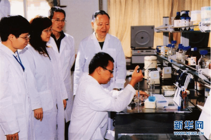 卢永根(后排右一)在室内指导学生(资料照片)。 新华社发(华南农业大学供图)