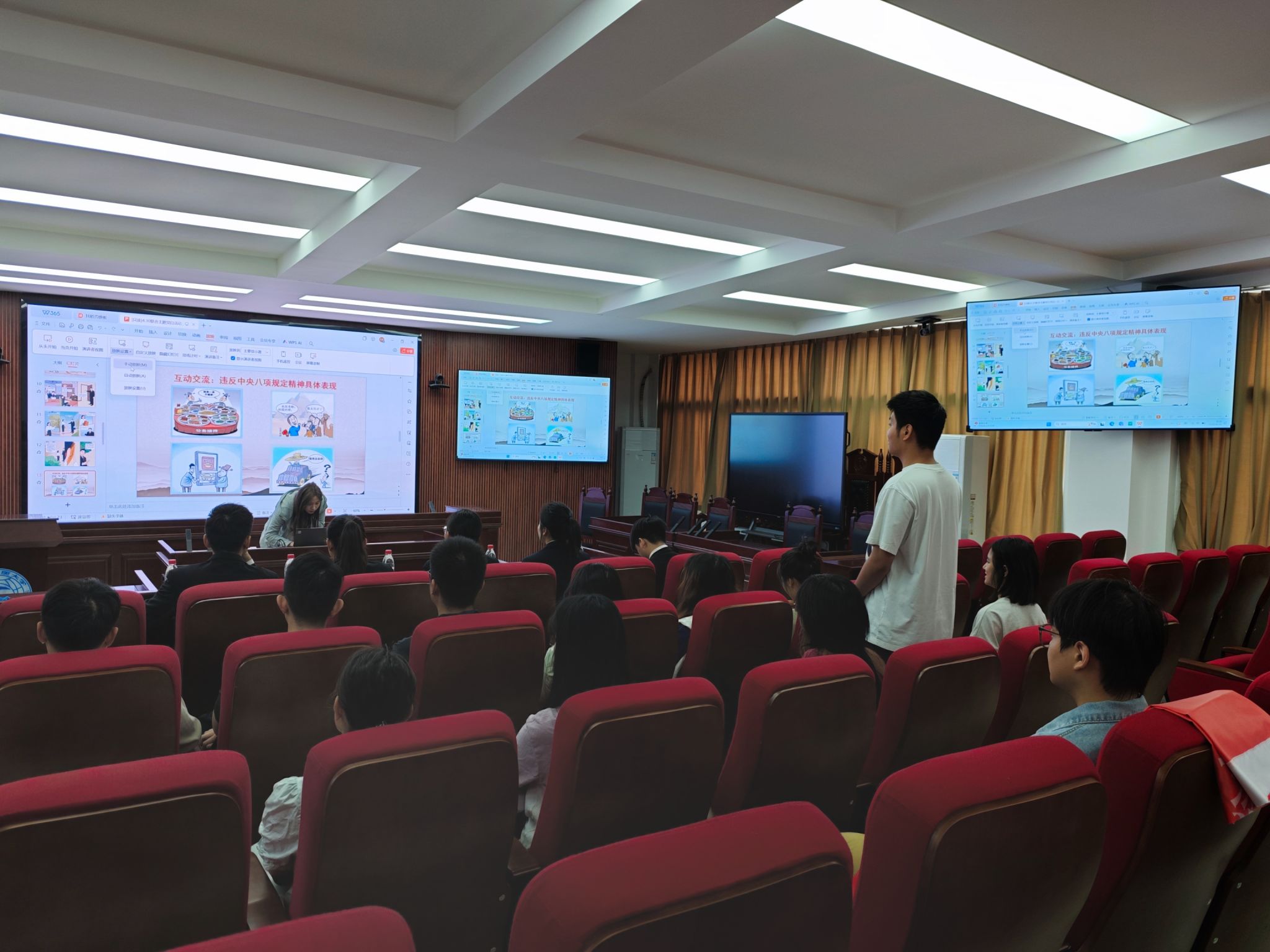 与会党员集中学习中央八项规定精神。公共管理学院法学第二党支部书记周丽带领大家详细解读中央八项规定的历史意义、核心特点及重大影响。她提及,中央八项规定出台十余年来,其贯彻执行已成为衡量党员干部政治意识、规矩意识的重要标尺,促进了政府简政放权、基层精简会务、文风转实,并形成了从“关键少数”到“全体党员”的示范引领,营造了风清气正的干事创业环境。作为青年党员,我们要深刻领悟中央八项规定精神的核心要义,始终保持清正廉洁的政治本色。