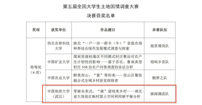 11月4日,由教育部高等学校公共管理类专业教学指导委员会主办、中国土地学会指导、西北农林科技大学承办的第五届全国大学生土地国情调查大赛决赛在陕西杨凌成功落下帷幕。本届大赛以“国土空间利用与和美乡村建设”为主题,吸引来自全国85所高校的191支队伍参加,最终49支队伍晋级决赛。由我院徐枫教授和经管学院金贵教授共同指导的学生团队在激烈的竞争中脱颖而出,参赛作品《零碳未来式,“碳”望绿美乡村——湖北省大悟县红畈村国土空间碳平衡分析》荣获全国特等奖。