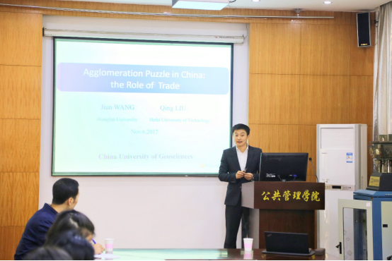 11月6日,应我校公共管理学院区域规划与信息技术系主任刘超副教授和书记张绪冰副教授的邀请,上海大学商学院助理教授汪健博士做客我校,在公共管理学院进行了地理环境与国家公园学术系列报告。汪健博士在日本立命馆大学获得经济学博士学位,是悉尼科技大学与纽约大学访问学者,其主要研究领域为空间经济学、城市与区域经济学、国际贸易。在Energy Policy、The Annals of Regional Science、Review of Urban and Regional Development Studies等SSCI英文期刊发表多篇文章,主持日本立命馆大学KOKUSAI TEKI研究基金、国家自然科学基金青年基金等项目。此次报告题为“Agglomeration puzzle in Urban China: The Role Of Trade”。报告会由刘超主任主持,区域规划与信息技术系教师和研究生聆听了报告。