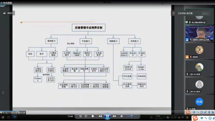 本次研讨会共分两个模块,分别是7月2-3日举行的“教学研讨模块”与7月8-9日举行的“主论坛及特色论坛模块”,我院师生全程参与了上述两个模块的研讨交流。在7月2-3日举行的“教学研讨模块”环节,我院钱文强老师作题为《应急管理的地大探索与实践》的主题报告,从专业设置的基本出发点、专业课程建设思路、具体实践等三个方面介绍了我院应急管理专业建设情况。