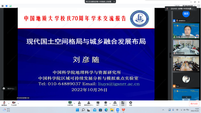 10月26日,为迎接我校70华诞,中国科学院地理科学与资源研究所研究员、发展中国家科学院刘彦随院士应邀为我校师生作题为“现代国土空间格局与城乡融合发展布局”的线上学术讲座。讲座由胡守庚院长主持。