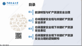 中国地质大学(武汉)公共管理学院周娜副教授作题为《总体国家安全观下关键矿产资源安全治理的国家逻辑》的主旨报告。周娜副教授认为新能源、新技术和新材料等新兴产业的发展,使关键矿产资源需求激增,已成为全球主要国家资源安全治理的焦点。在梳理已有矿产资源安全评价理论、全球价值链理论和国家资源治理理论的基础上,周娜副教授从总体国家安全观的内涵出发,以锂资源为例剖析了总体国家安全观下关键矿产资源安全表征,并从治理主体、治理目标、治理方式三个维度解构了总体国家安全观下关键矿产资源安全的治理逻辑。