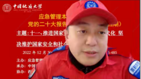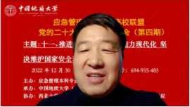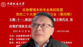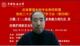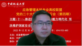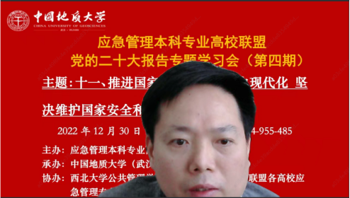 (通讯员黄砺)12月30日下午,由应急管理本科专业高校联盟主办,中国地质大学(武汉)公共管理学院承办,西北大学公共管理学院(应急管理学院)、联盟各高校应急管理专业虚拟教研室和武汉市黄鹤应急救援队协办的党的二十大报告专题学习会(第四期)成功召开。本次专题学习会的主题为:推进国家安全体系和能力现代化,坚决维护国家安全和社会稳定。与会人员包括来自武汉大学、中国地质大学(武汉)、西北大学、中国科学院、内蒙古大学、中国劳动关系学院、武汉市黄鹤应急救援队等单位在内的200余位专家学者、师生参加。