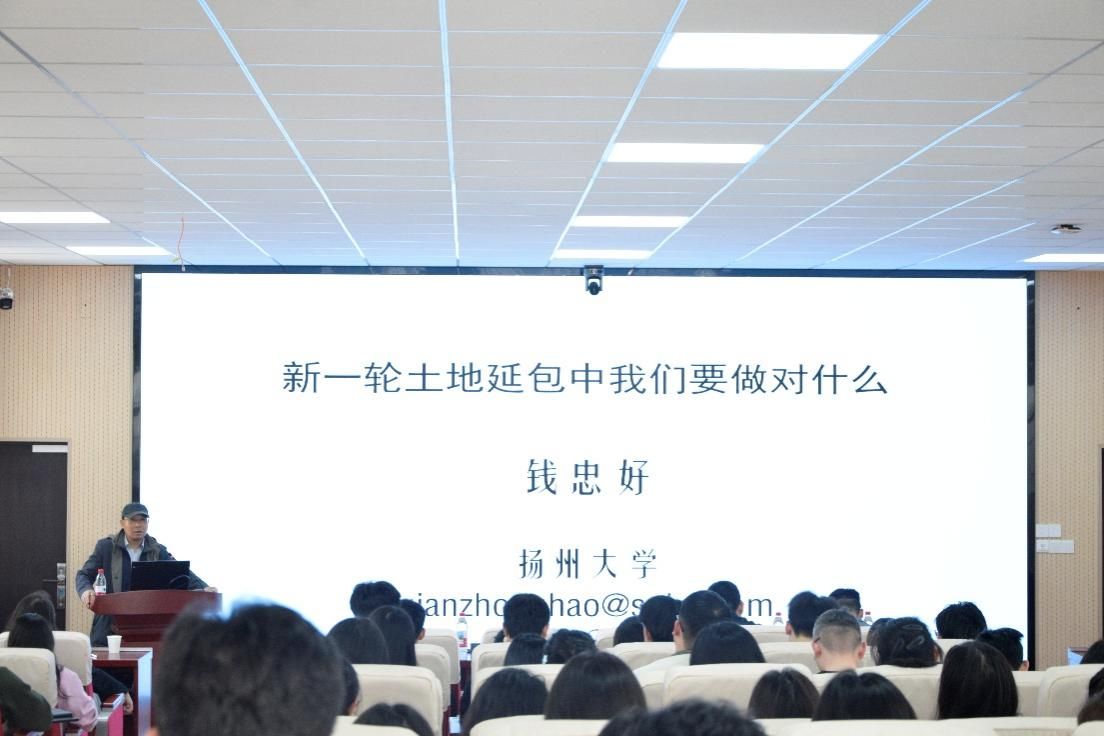 3月24日下午,应公共管理学院土地资源管理系杨剩富副教授邀请,扬州大学商学院钱忠好教授做客我院“公管大讲堂”,以“新一轮土地延包中我们要做对什么”为题开讲。杨剩富主持讲座,讲座吸引百余名师生参加。