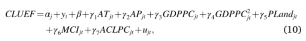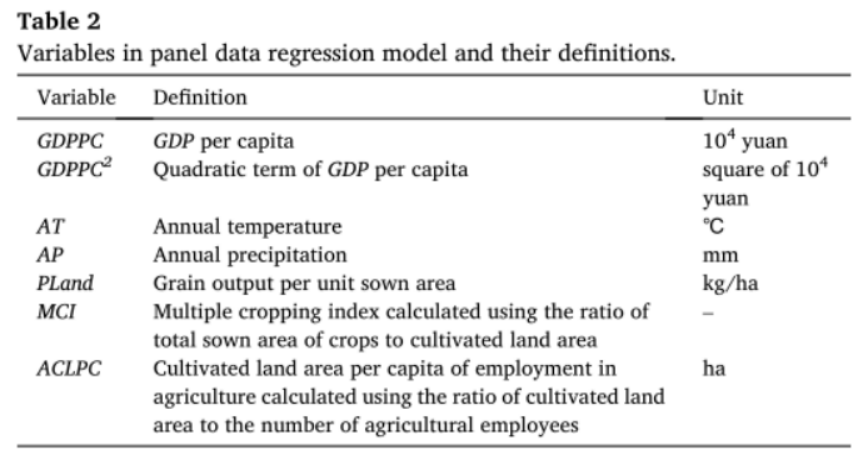 3. FTCE的估计和回归模型为了确定FTCE过程,采用面板数据回归模型,并以CEFs为因变量。可以看出,在FTCE过程中,CEFs与社会经济发展水平之间存在非线性关系。考虑到人均GDP是衡量社会经济发展水平的关键指标,本文引入人均GDP (GDPPC)及其二次项(GDPPC²)作为关键变量。以温度和降水为特征的气候因子是影响耕地生态系统和CLU活动的基本环境因子。因此,引入年气温(AT)和年降水量(AP)作为自变量。NFUI是CLU生态过程的关键指标,NFUI的变化本质上是耕地资源与化肥替代的结果。根据农业生产的诱导替代理论,这种替代是由耕地资源的稀缺性和农民的土地使用目标所主导的。因此,引入的自变量如下:衡量耕地资源稀缺性的农业人均就业耕地面积(ACLPC)、与农民土地使用目标密切相关的单位播种面积粮食产量(PLand)以及复种指数(MCI)。