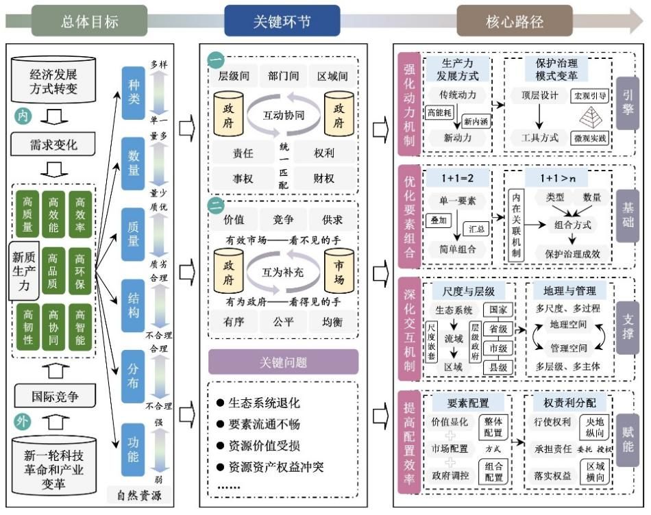 山水林田湖草沙作为最根本的生产要素,是新质生产力发展的重要支撑,其丰富的资源类型、稳定的内部结构、合理的空间布局、有序的主体关系,为新质生产力发展提供了坚实基础。因此,研究在辨析新质生产力发展与山水林田湖草沙一体化保护和系统治理的特征与要求基础上,厘清新质生产力发展与山水林田湖草沙一体化保护和系统治理互动的理论逻辑。聚焦面向新质生产力发展的山水林田湖草沙一体化保护和系统治理的总体目标和关键环节,以协调关键关系和化解“资源”与“资产”管理过程中的关键问题为导向,提出了新质生产力发展助推山水林田湖草沙一体化保护与系统治理的四大核心路径。