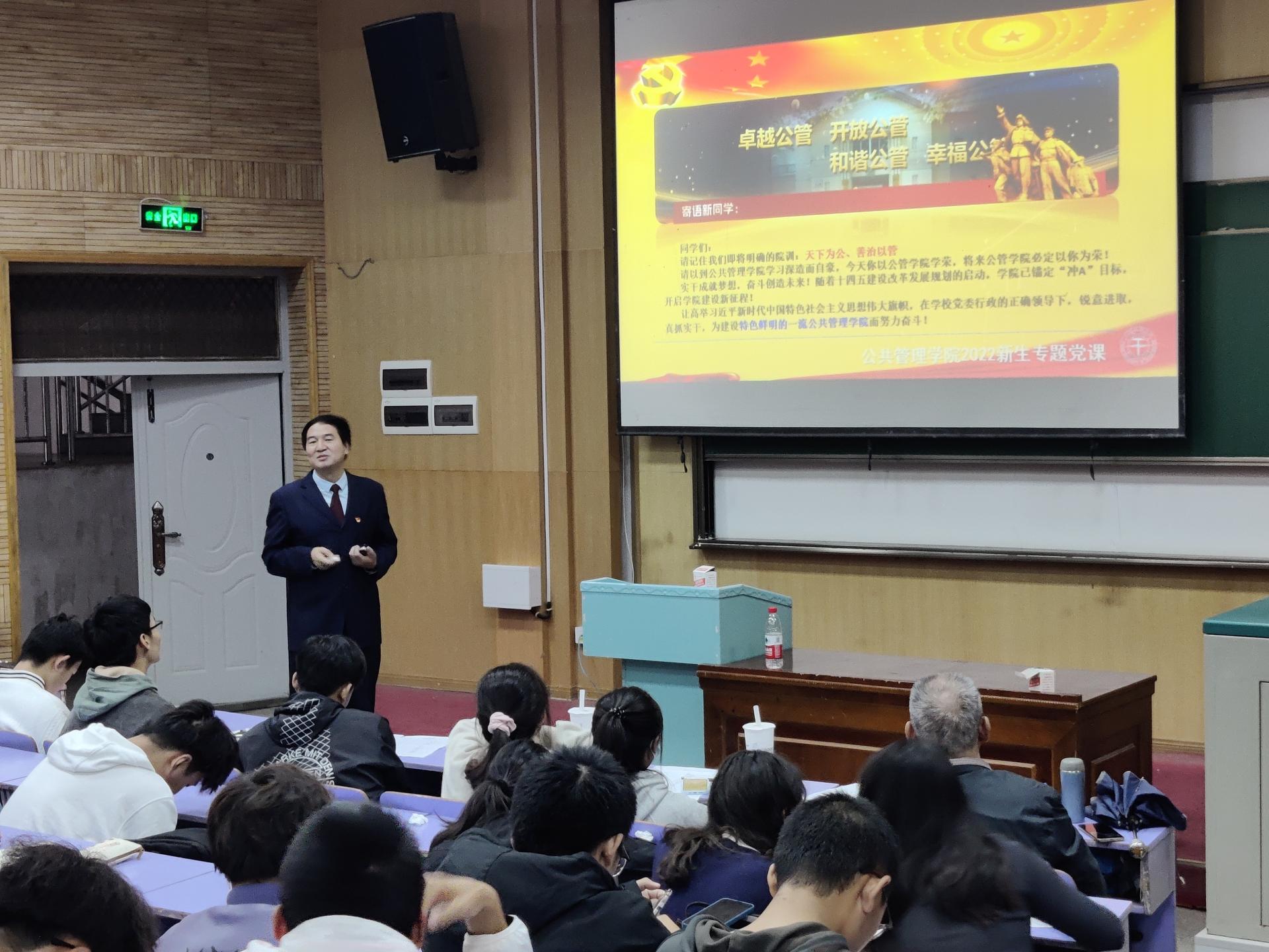 张书记首先解读“公共管理”中的“公”和“管”的涵义,分析了公共管理的深刻内涵和学科属性,并详细介绍了我院建设发展情况。近年来,我院秉承“人才立院、开放活院、实干兴院、创新强院”的发展思路,和建设“卓越公管、开放公管、和谐公管、幸福公管”的发展目标,坚持对接国家重大战略需求,从科研平台、实践基地、师资队伍、科研成果、社会服务等方面正在全力建设特色鲜明的一流公共管理学院,在学院的长期办学实践过程中,逐渐凝练出“天下为公 善治以管”的院训,为培养有为的公管人创造了良好的条件。