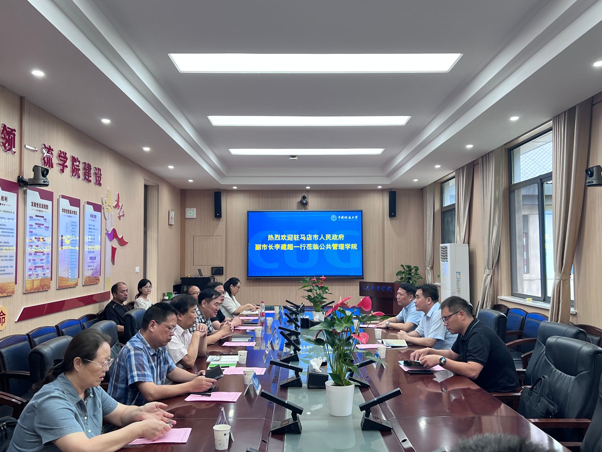 座谈中,李建超深情回顾起大学毕业后的经历,讲到地大“艰苦朴素 求真务实”的校训精神潜移默化地一直激励自己扎根基层,努力工作,并详细介绍了驻马店市市情,希望得到公共管理学院的科技赋能,助力驻马店市高质量发展。