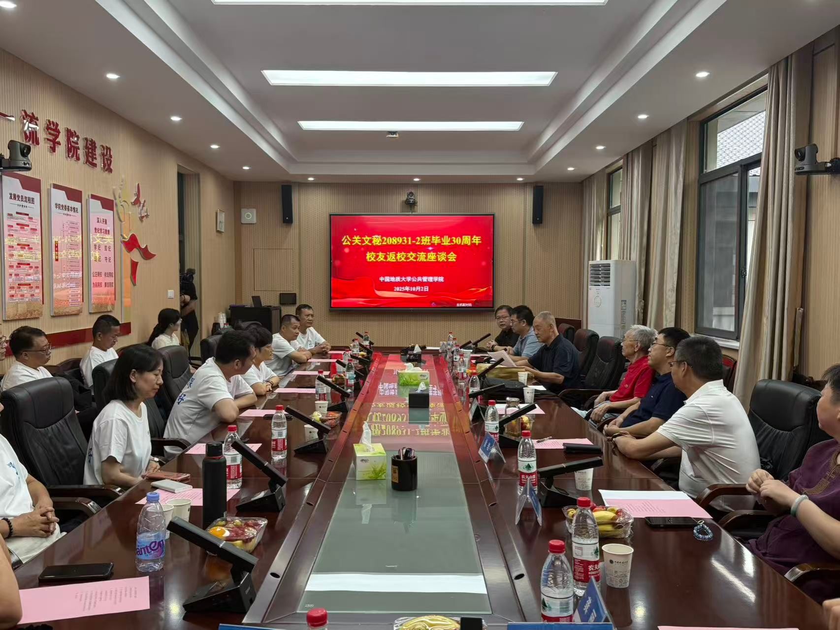 10月2日下午,1995届现代文秘与公共关系专业208931、208932班校友和2005届土地资源管理专业023011、023012班校友在学院举行师生座谈会。学院党委书记徐岩,院长龚健,党委副书记龚丽,副院长朱江洪,学院老领导、原班级班主任、授课教师代表、各系领导参加座谈会。