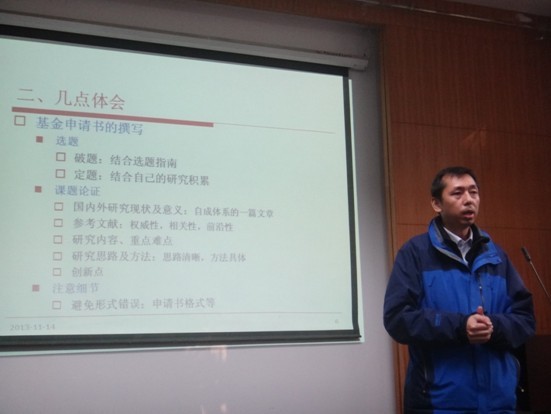 2013年11月14日15:00时,公共管理学院第二期“公管青年论坛”:社科基金申请经验交流会在北二楼209召开。会议由院青年教师联谊会会长胡守庚主持,公共管理学院党委书记张吉军,副院长才惠莲等出席交流会,经济管理学院刘江宜副教授应邀作社科基金申请经验交流报告。