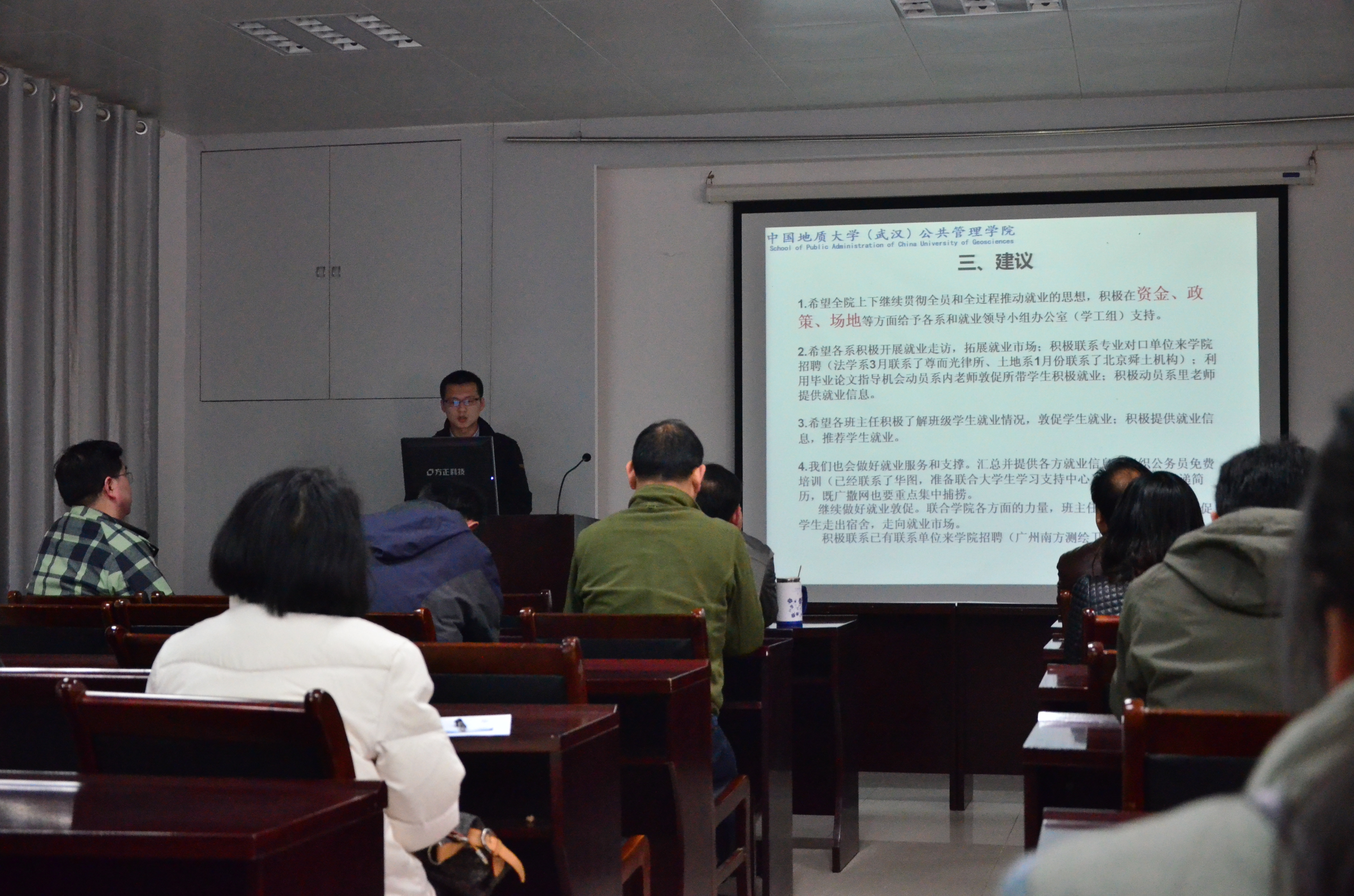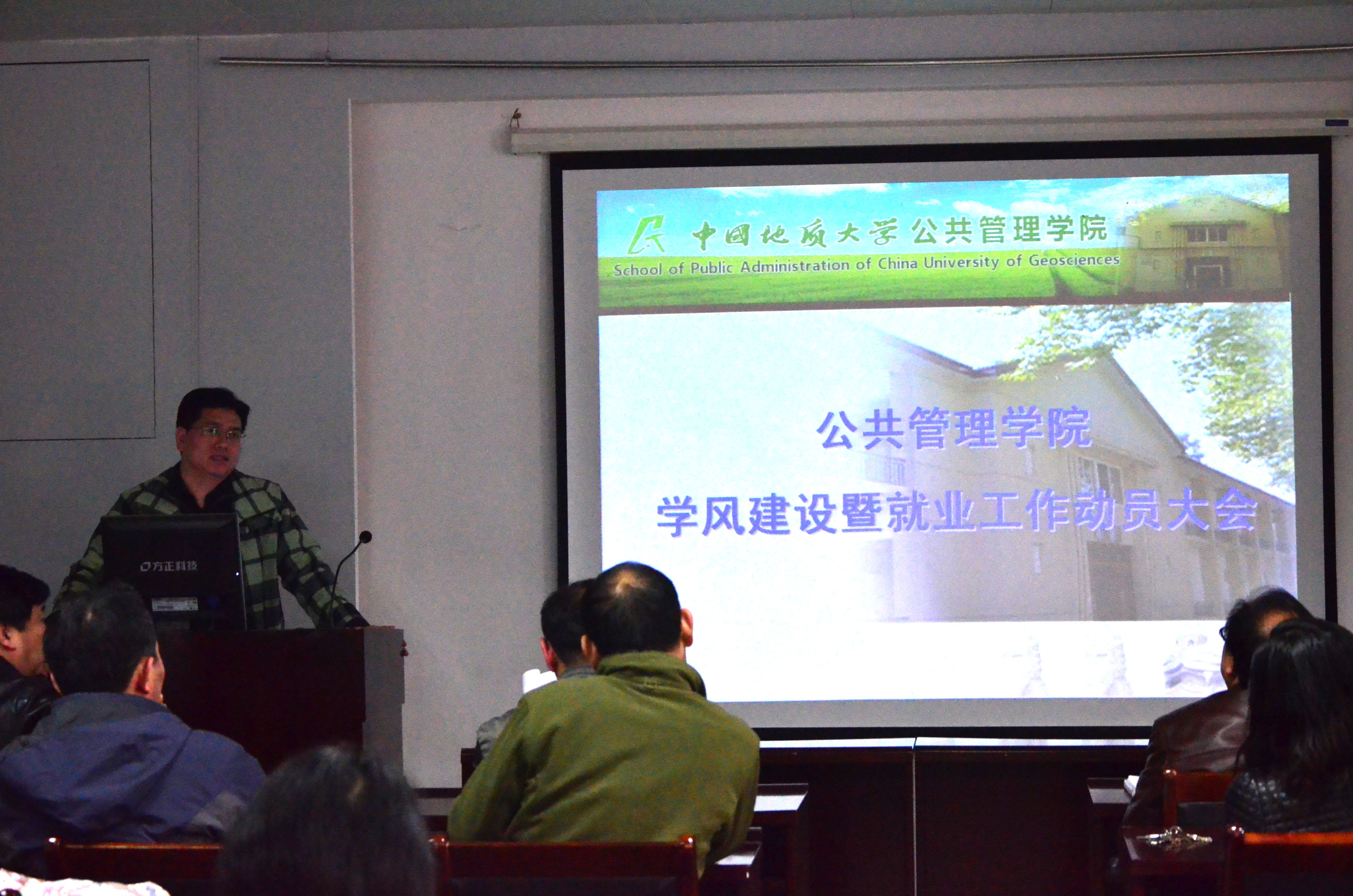 4月9日下午,公共管理学院2015届毕业生就业工作推进会在公共管理学院国土法律评价实验室101顺利召开,参加此次会议的有学院党委书记张吉军、院长李江风,分管教学、科研、研究生工作的副院长,各系系主任及2015届本科毕业班各班班主任、部分研究生导师、学工组全体老师。会议由党委副书记胡文勤老师主持。