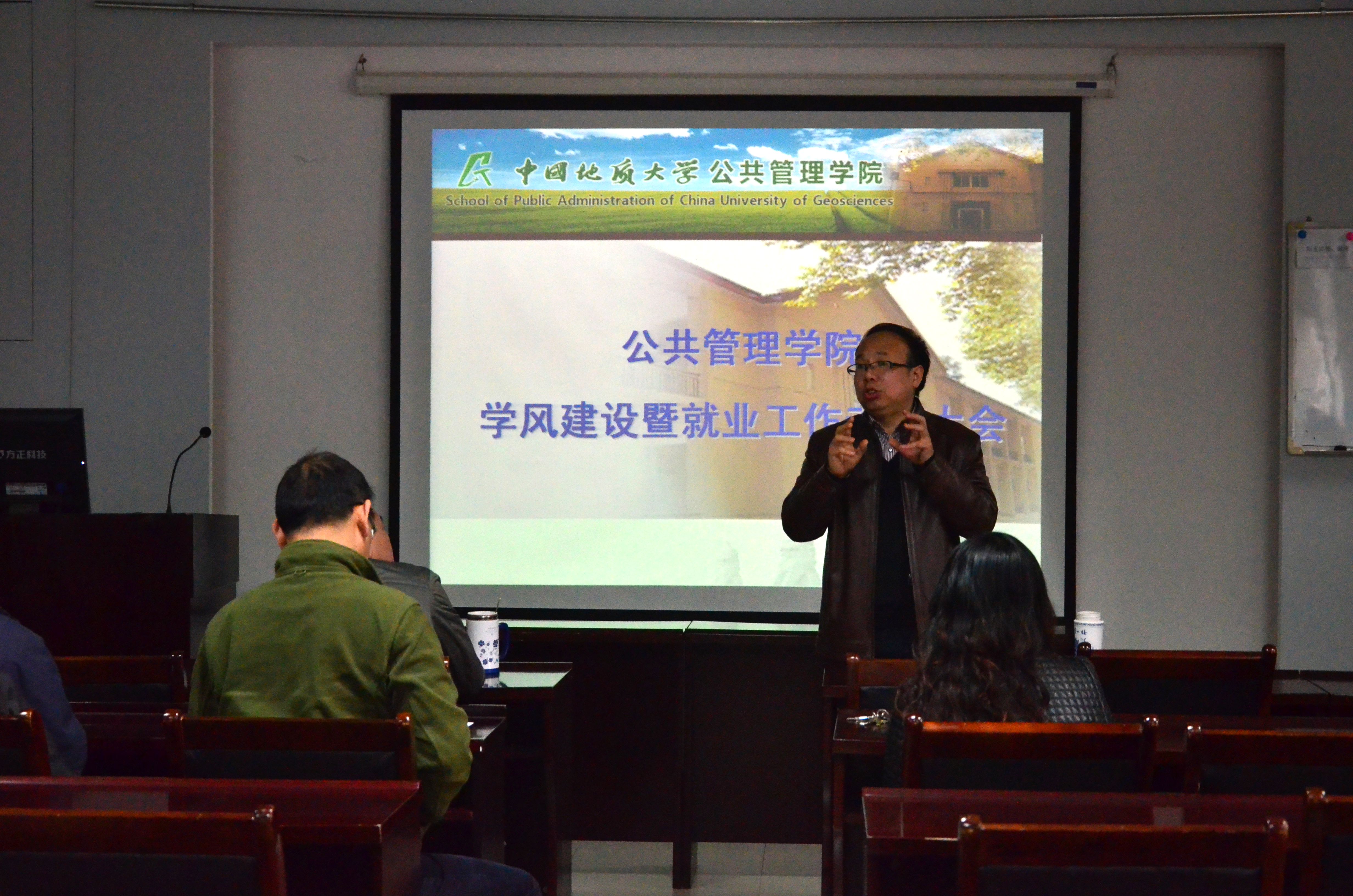 4月9日下午,公共管理学院学风建设动员大会在国土法律评价实验室101顺利召开,参加此次会议的有学院党委书记张吉军、院长李江风,分管教学、科研、研究生工作的副院长,各系系主任及本科年级各班班主任、部分研究生导师、学工组全体老师。会议由党委副书记胡文勤老师主持。
