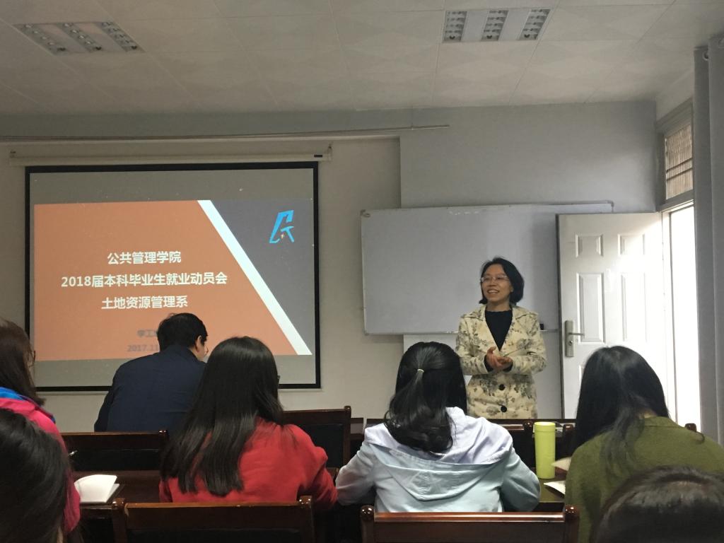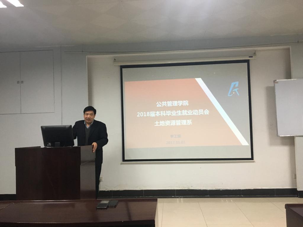2017年11月1日下午4点,公共管理学院土地资源管理系2018届本科毕业生就业动员会在公管新楼101室顺利召开。学院副院长王占岐,院党委副书记胡文勤,土地资源管理系教授周学武、班主任渠丽萍,院团委副书记、2018届本科生辅导员李姝慧以及土地资源管理专业2018届本科毕业生参加此次会议。