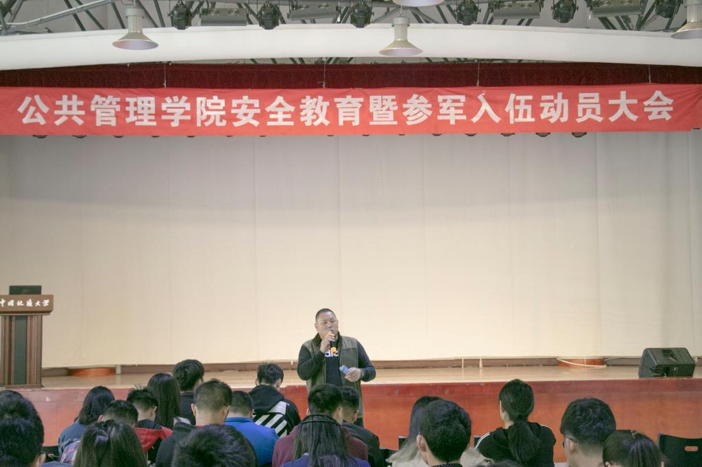 2018年4月15日,公共管理学院安全教育暨参军入伍动员大会于大学生活动中心二楼成功举行。本次大会特别邀请到校党委武装部副部长单红峰老师担任主讲人。公共管理学院党委副书记胡文勤老师、团委书记郭玉凤老师、团委副书记李姝慧老师、各班生活委员及各宿舍的宿舍长参与了本次大会。