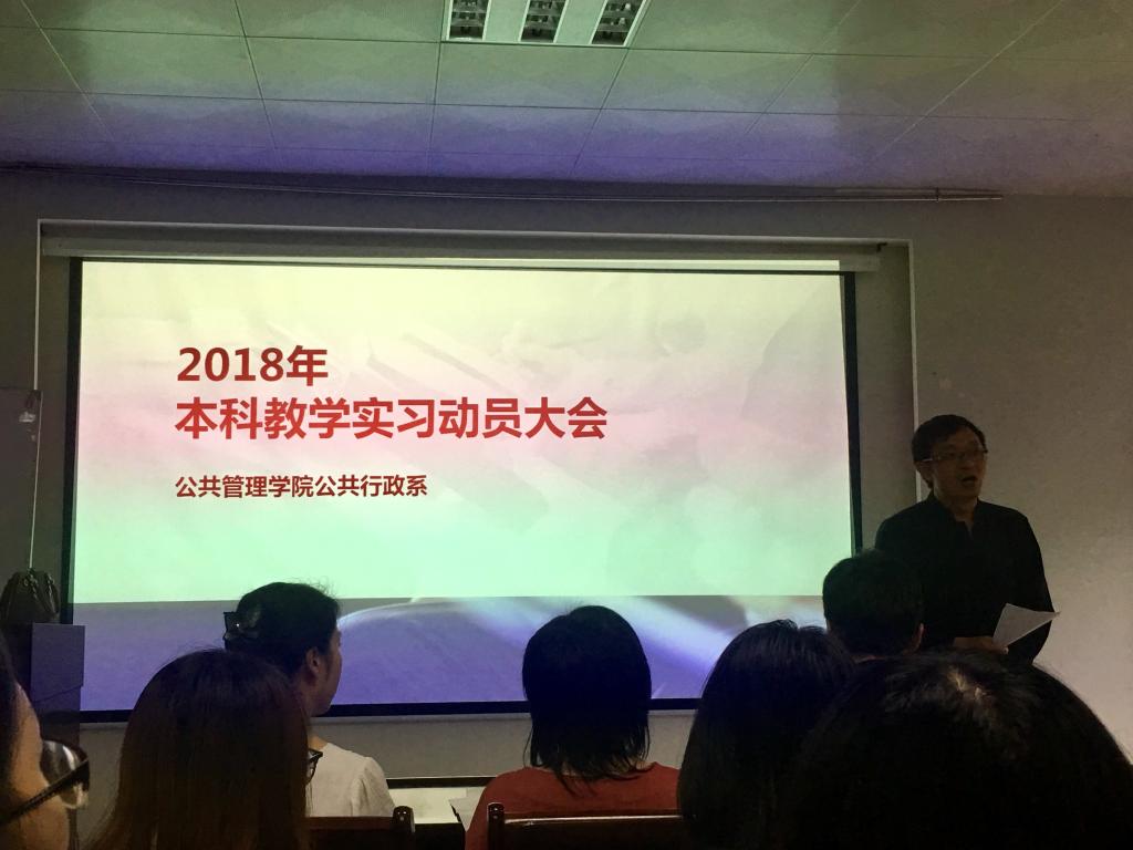(通讯员 张士菊 李想)2018年6月22日,我院公共行政系在实验楼101召开了2018年本科教学实习动员大会。出席会议的有秭归实习的带队队长田家华教授、陈星博士,洪山区政府实习的指导老师苏黎兰博士,孝感实习的指导老师黄砺博士,以及2016级的行政管理和公共事业管理专业的全体本科生。本次会议由公共行政系系主任李世祥教授主持。