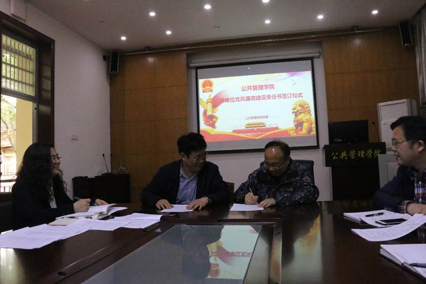 (学院通讯员 李姝慧)4月16日下午,公共管理学院三级单位党风廉政建设责任书签订仪式在学院B209室进行,学院党委书记张吉军、副书记胡文勤,纪委书记、副院长才惠莲,纪委委员、副院长王忠,学院三级单位党政负责人参加签订仪式。