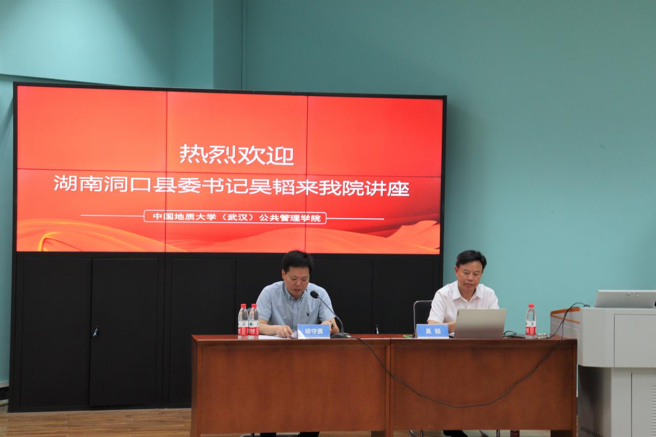 6月26日,应学院邀请,湖南省邵阳市洞口县委书记吴韬来我院开展讲座。讲座主题为“新时代湖南省洞口县基层社会治理工作的‘六零密钥’”。我院教师代表、近百名学生在北一楼学术报告厅聆听此次讲座。讲座由胡守庚院长主持。