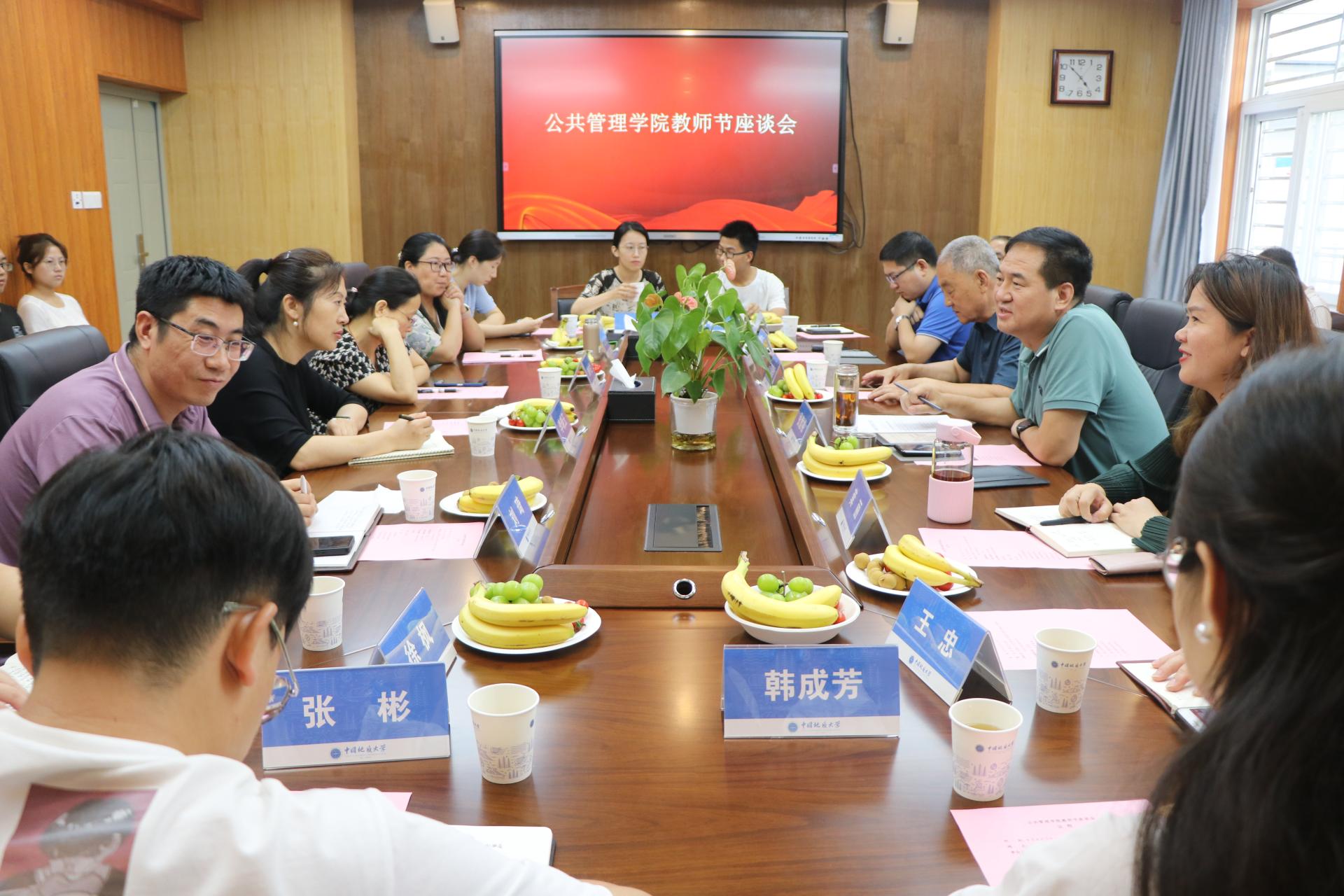 夏热渐退,孟秋到来。为深入学习贯彻党的二十大精神,进一步开展学习贯彻习近平中国特色社会主义思想主题教育,营造全院尊师重教的良好氛围,激励广大教师积极投身教育强国建设实践,在第39个教师节即将到来之际,公共管理学院于9月8日下午16:00在北一楼227会议室召开以“躬耕教坛,强国有我”为主题的教师节师生座谈会。学院党委书记张宽裕、副院长王忠、副院长李世祥、副书记龚丽、退休教师代表王宗廷以及部分教师代表、学生代表参加会议。座谈会由张宽裕书记主持。