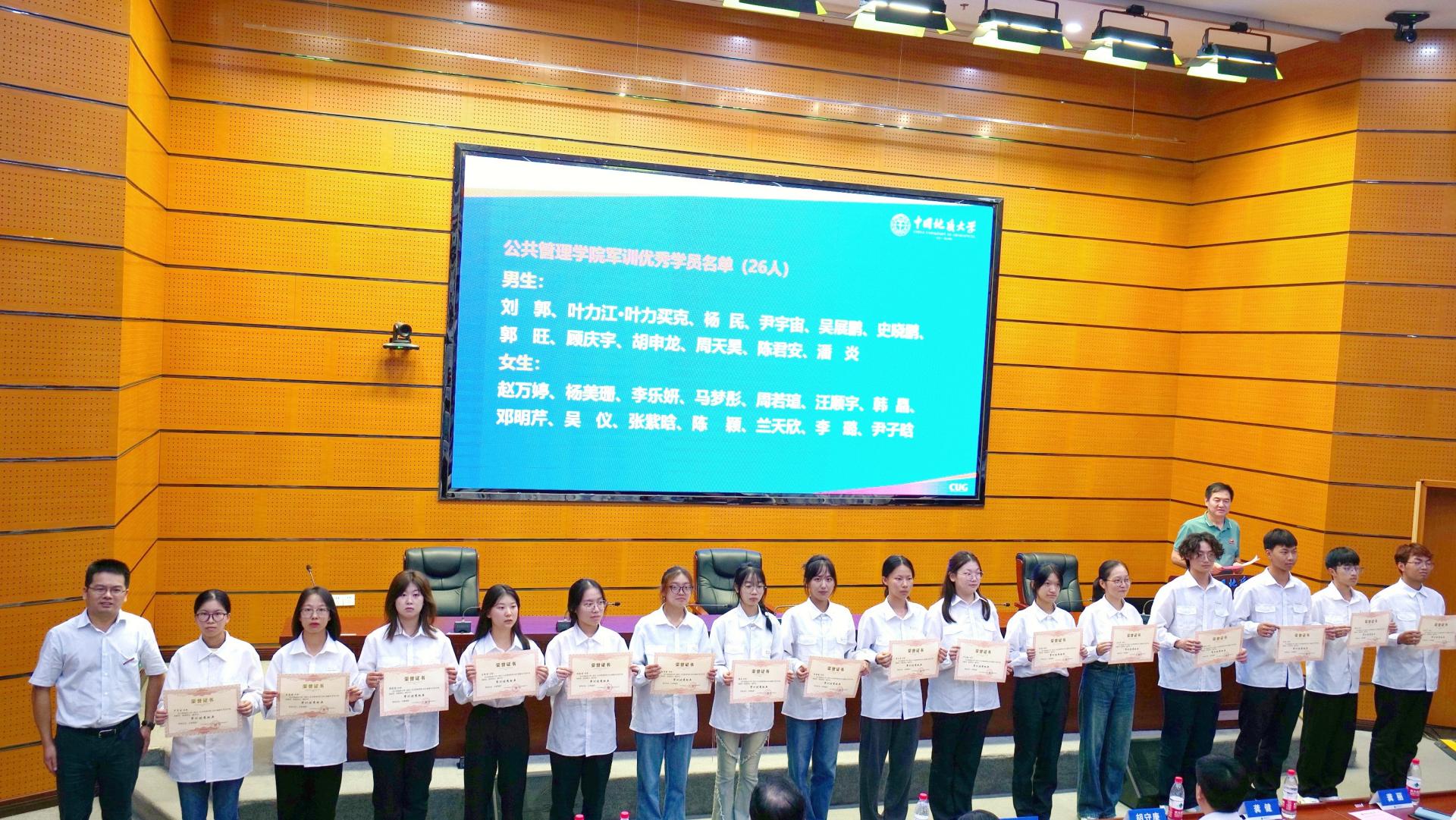 学院党委副书记龚丽宣读学院2023年军训表彰决定,学院副院长龚健为26名军训优秀个人颁发荣誉证书。