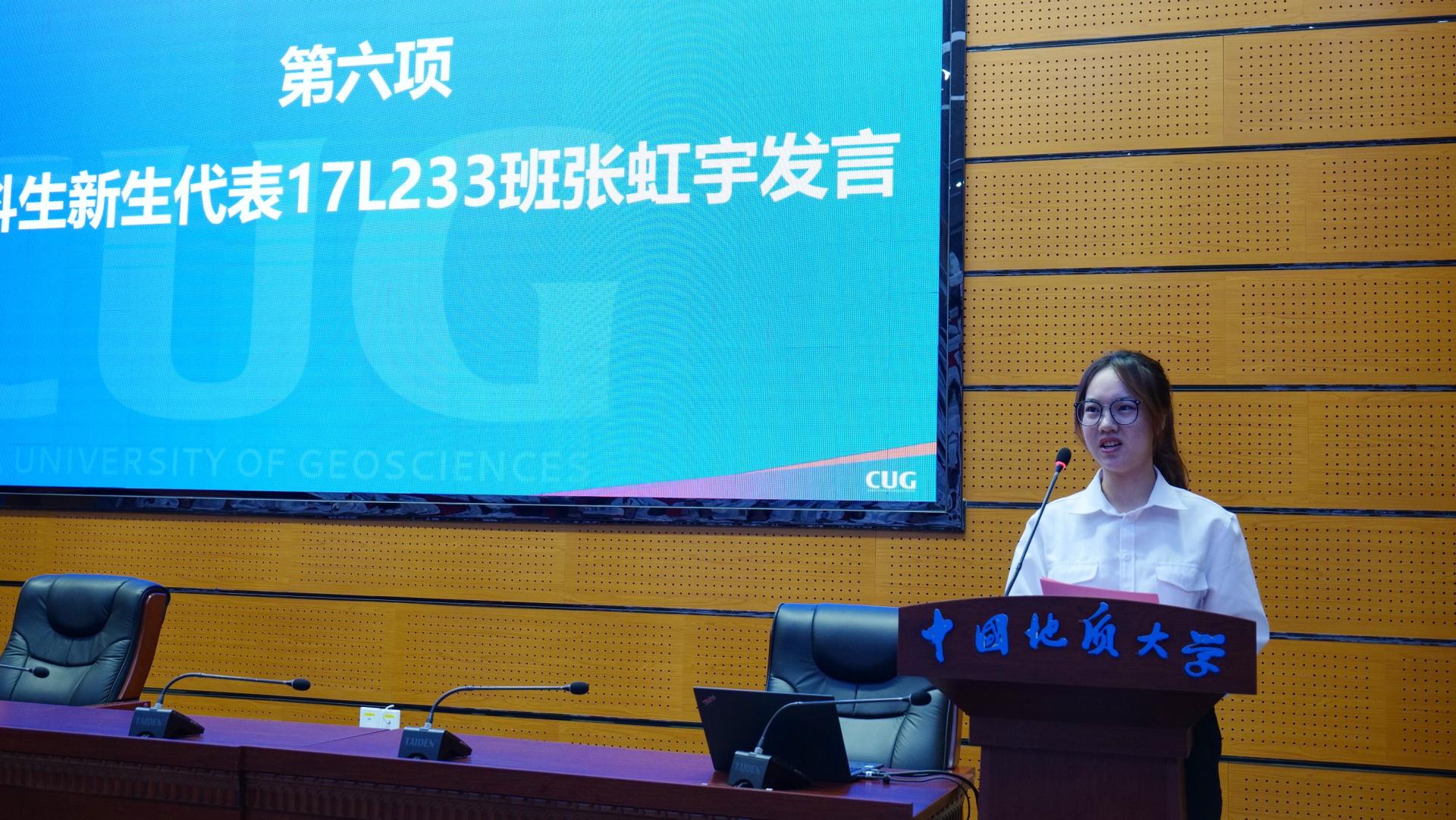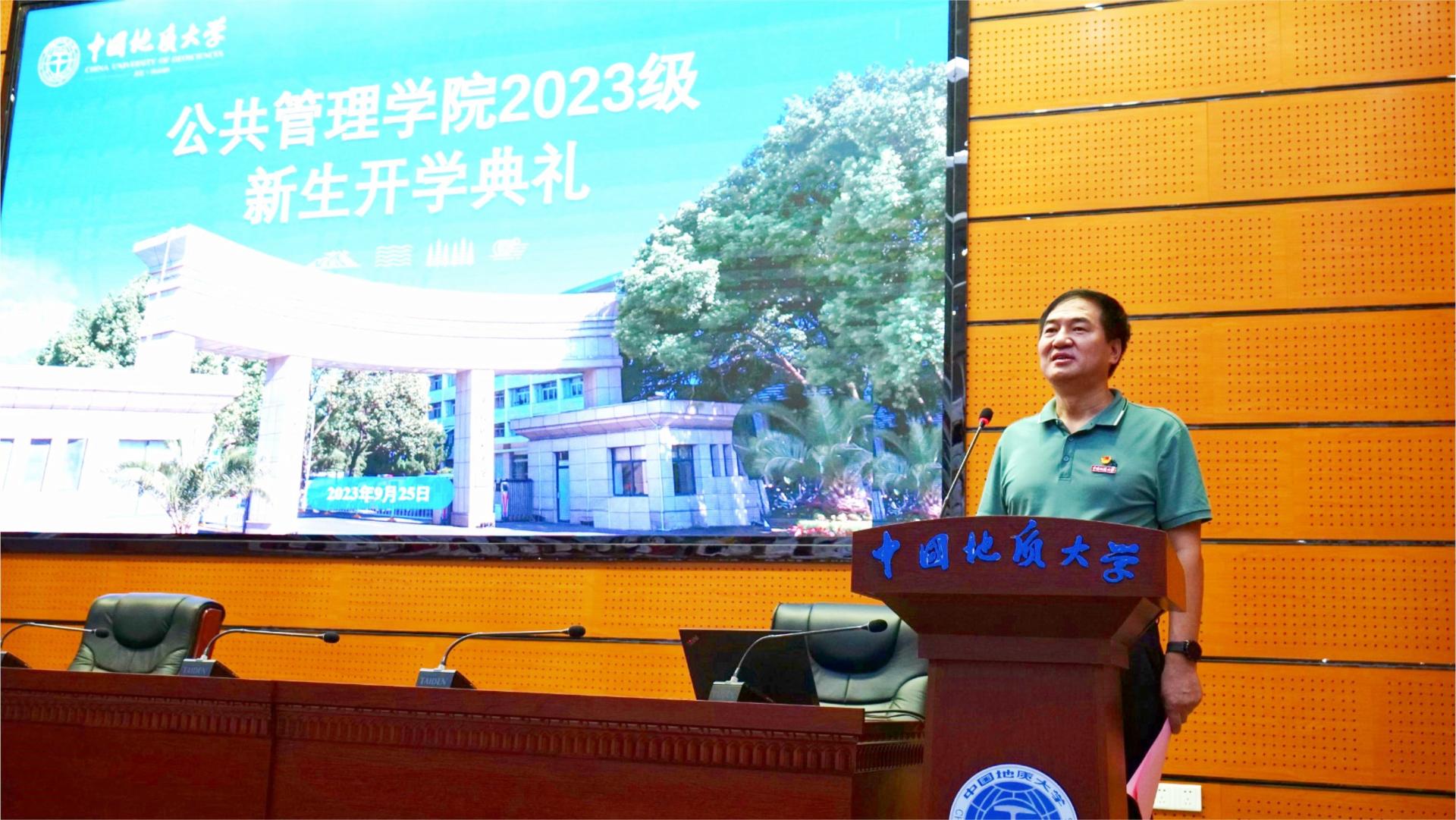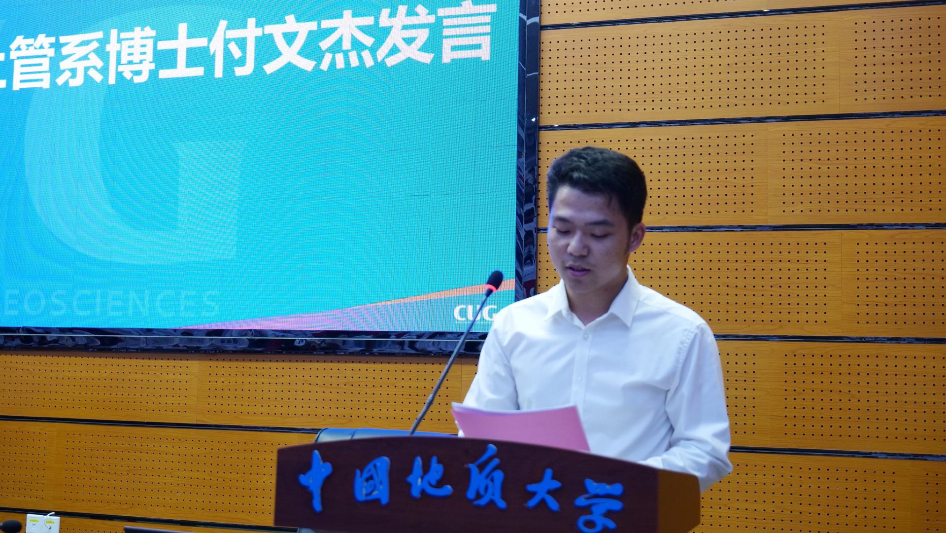 2023级本科生张虹宇、公共管理专业博士付文杰分别作为本科生新生代表和研究生代表发言。他们表示作为地大公管学子要始终践行“天下为公,善治以管”的院训精神,顺应国家战略需求和学校建设目标,精进不休,笃行不怠,努力成为时代的开拓者和实干家。