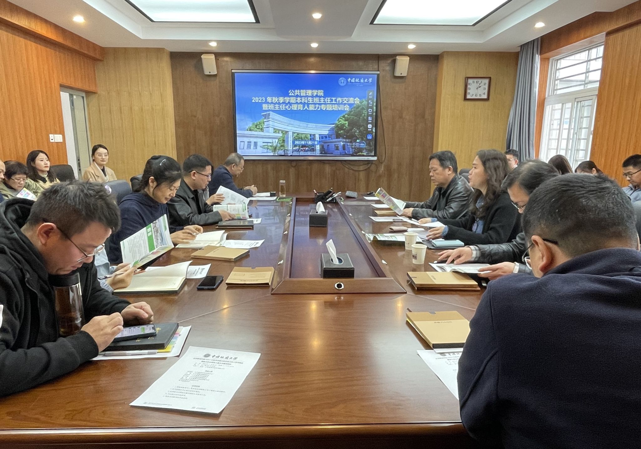 为加强学院班主任队伍建设,全面提升班主任管理水平与业务素养,充分发挥班主任育人作用,完善学院“三全育人”格局。11月21日下午14:00,我院在北一楼227会议室召开2023年秋季学期本科生班主任工作交流会暨班主任心理育人能力专题培训会。学院党委书记张宽裕,副书记龚丽,副院长王忠、李世祥、朱江洪,全体班主任、辅导员参会。会议由龚丽主持。