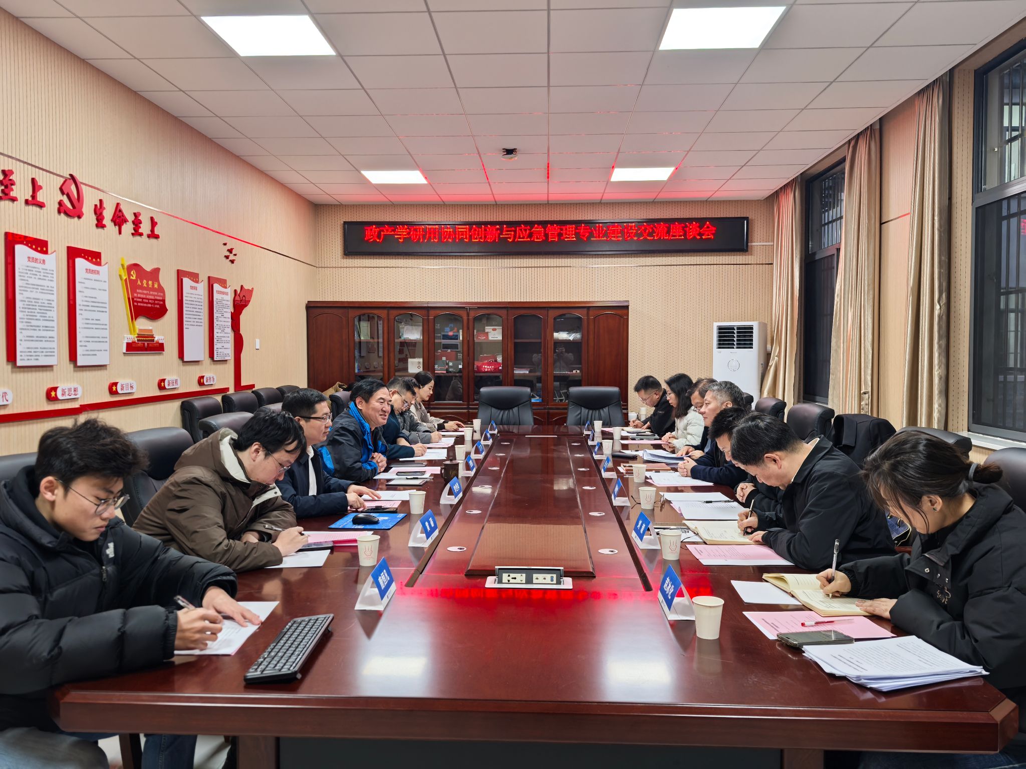 12 月 12 日下午 ,政产学研用协同创新与应急管理专业建设交流座谈会在我校南望山校区北区北2楼B105会议室举行。湖北省应急管理厅应急救援中心主任昝军、科技信息化处处长彭仕优、执法处副处长王高锋等,长江北斗经理李剑,我校公共管理学院党委书记张宽裕、副院长兼应急管理专业负责人李世祥教授及应急管理系教师代表,工程学院汪洋教授、地理与信息工程学院张绪冰副教授等参加会议。