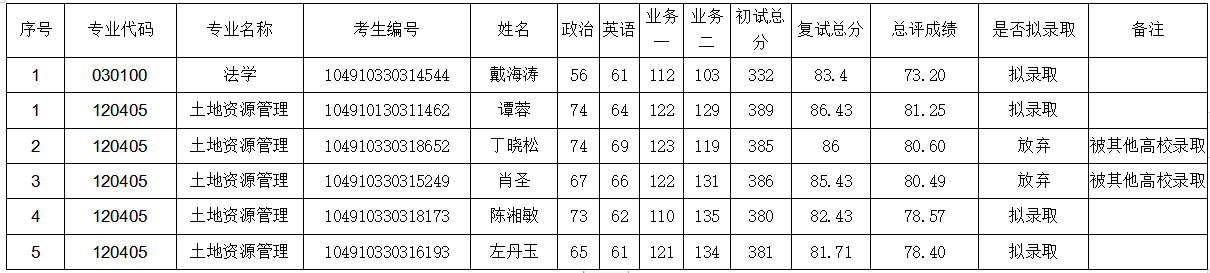 考虑公共管理学院学科发展需求,经学院申请,研究生院同意,给予我院法学专业增加一个指标,土地资源管理专业增加3个指标。现将补录结果公示如下(顺位录取。如有放弃,顺次录取):