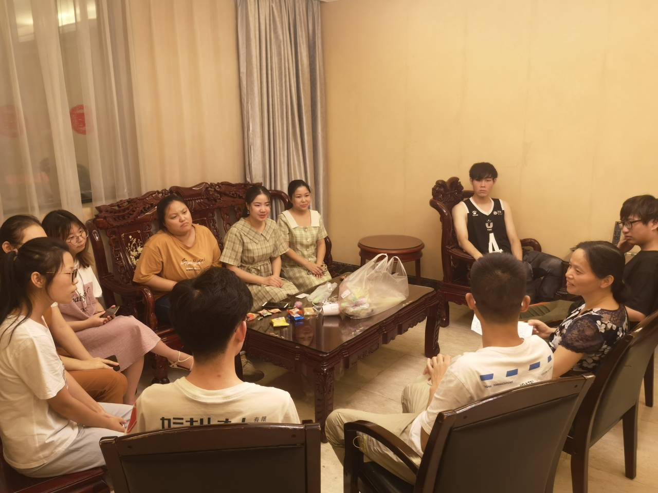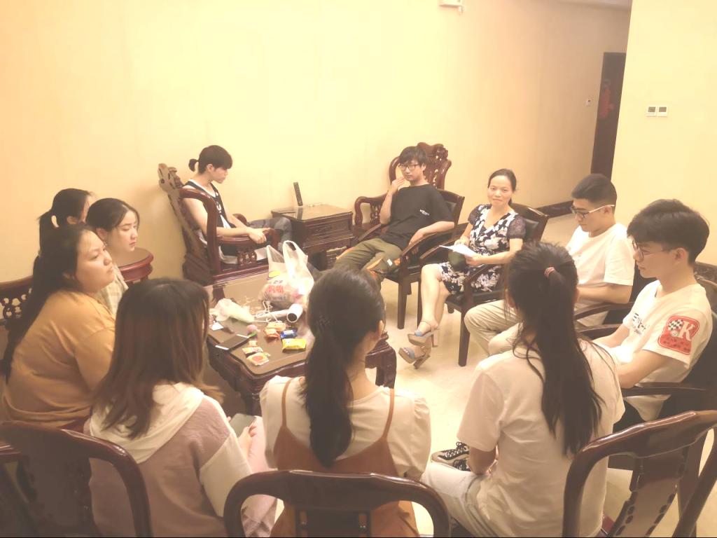 2019年8月15日晚7:30,刘中兰老师与第一小组10名同学就孝感政府实习半个月的工作状况、实习体验及生活情况等进行了轻松愉快地交流慰问。