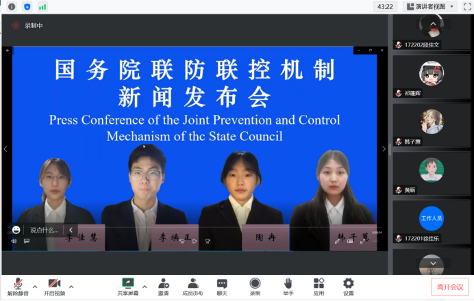 (通讯员 刘中兰 鲍媛媛)为激发公共行政系学子对新闻发言的兴趣,鼓励学生关注时事热点,培养学生综合实践能力,凸显公共行政系专业培养方案特色,12月23日,公共行政系172201、172202、173201、173202班全体学生开展了模拟新闻发言人实训活动。因疫情防控需要,采用腾讯会议线上组织进行。本次《模拟新闻发言人》课程实践训练活动由刘中兰老师组织和主持,参加的评委老师有卓成刚教授、罗辉教授、李晓玉副教授、刘中兰副教授和黄砺副教授。