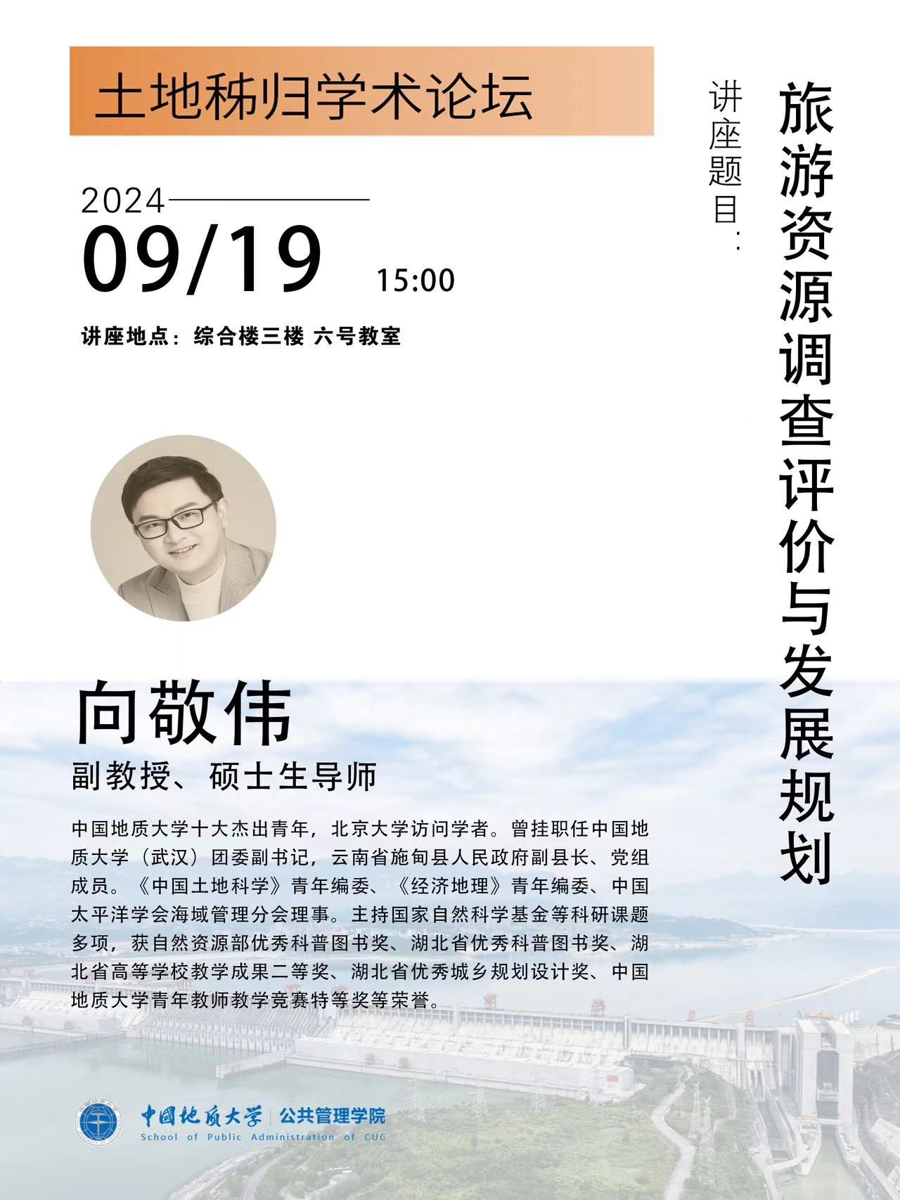 向敬伟老师讲述了旅游资源分类、调查、评价的内涵和方式。讲座中向老师结合秭归县独特的地理资源和旅游开发情况,从土地利用规划角度解析了如何挖掘地域特色,科学评估资源价值,为旅游业的可持续发展提供保障。随着农文旅融合的深入发展,土地的经济效益、社会效益、生态功能及文化价值正不断凸显,细致调查和精准评价,让每一片土地的文化内涵得以彰显,有助于旅游业的可持续发展。