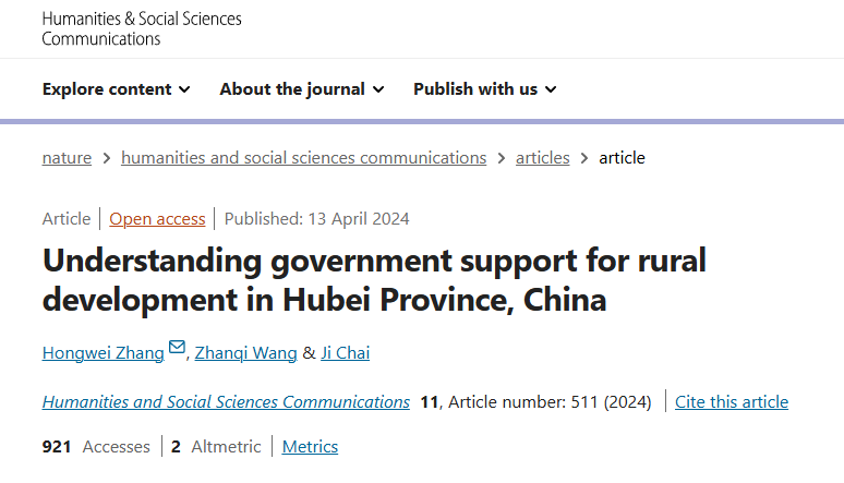 近日,我院王占岐教授团队在Humanities and Social Science Communications发表题为“Understanding government support for rural development in Hubei Province, China”的论文,提出了从地理空间上观察政府对于农村发展支撑力的全新视角、理论思路及测度方法。