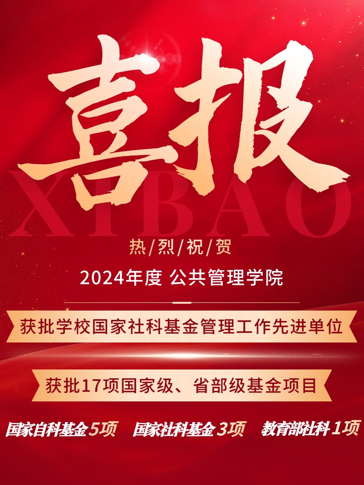 2024年度国家、教育部、湖北省各类基金项目委员会已相继公布项目申报评审结果。公共管理学院共获得17项资助(国家级8项,省部级9项),其中国家自然科学基金项目5项(面上2项),国家社科基金3项;教育部人文社科基金项目1项,湖北省联合基金培育项目1项,湖北省自科基金青年项目2项,湖北省社科基金一般项目(后期资助项目)3项,湖北省科技厅计划项目1项,湖北省教育厅哲学社会科学研究项目1项。
