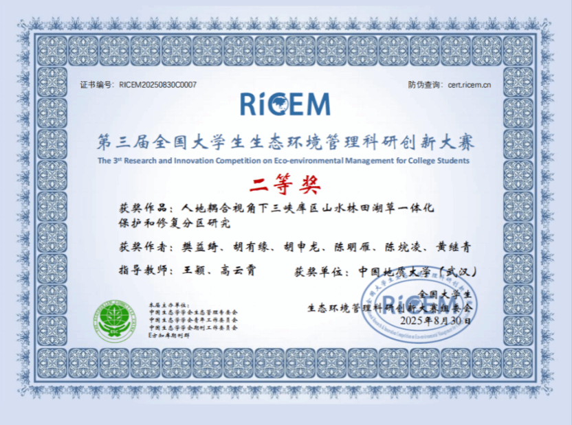 近日,第三届全国大学生生态环境管理科研创新大赛经过多轮评比,公布了比赛结果。由我院王颖老师与中国科学院地理所特别研究助理高云霄老师共同指导,我院学子樊益绮、胡有缘、胡申龙、陈明雁、陈烷凌及黄继青组成的“南望只此青绿”团队,凭借作品《人地耦合视角下三峡库区山水林田湖草一体化保护和修复分区研究》荣获全国二等奖。
