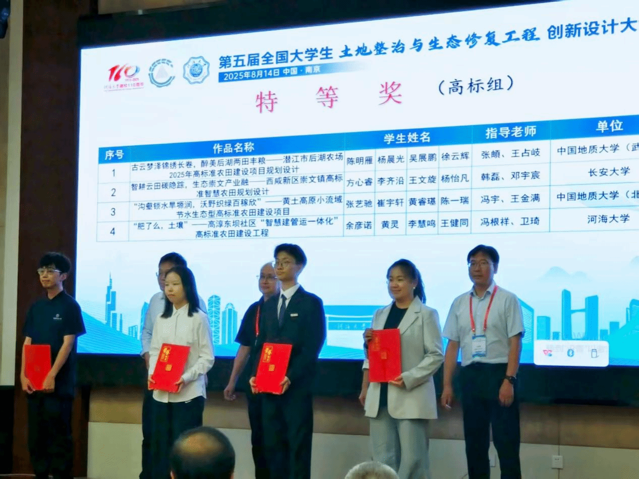 8月14日,第五届全国大学生土地整治与生态修复工程创新设计大赛决赛在江苏南京隆重举行,吸引了来自中国地质大学(武汉)、中国地质大学(北京)、长安大学等全国30余所高校的108支队伍同台竞技。由我校公共管理学院本科生组成的沃土先锋队完成的作品《古云梦泽锦绣长卷,醉美后湖两田丰粮——潜江市后湖农场2025年高标准农田建设项目规划设计》荣获大赛特等奖,指导老师张頔老师和王占岐教授获优秀指导教师奖。