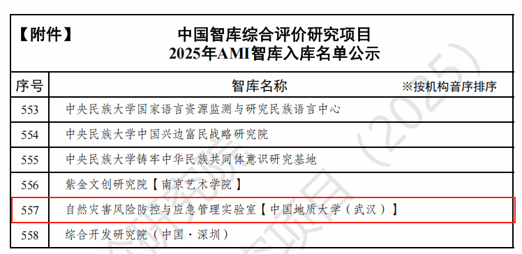 我校自然灾害风险防控与应急管理实验室入选中国智库综合评价研究项目(2025)AMI智库入库名单
