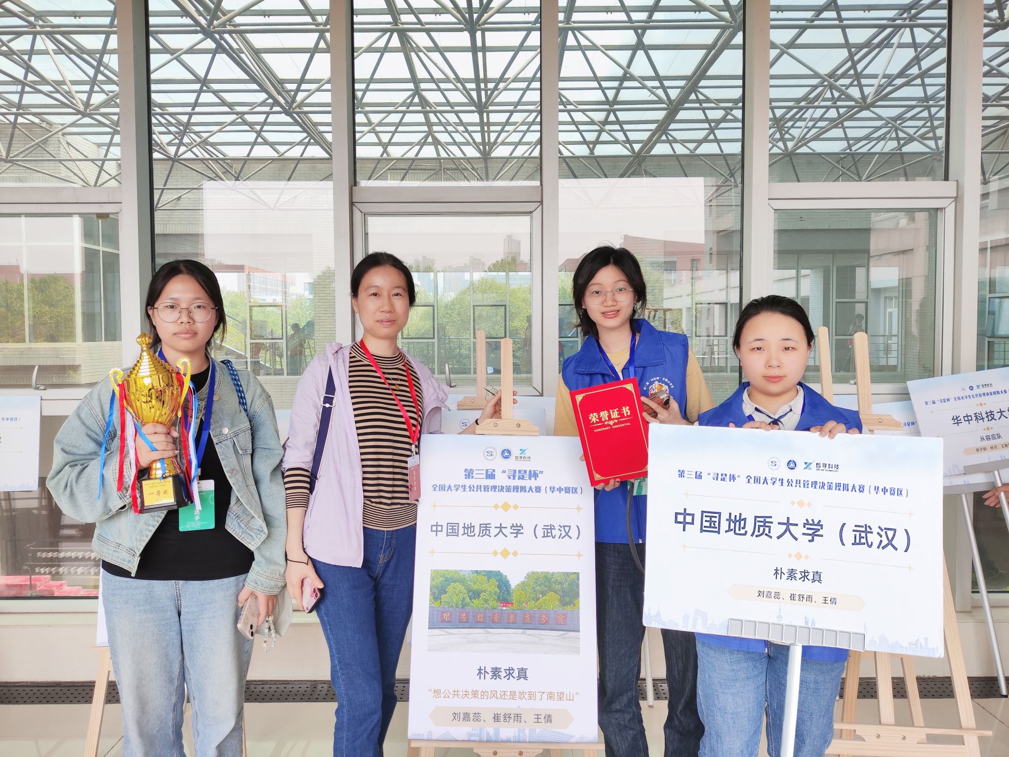 (通讯员 苏黎兰 刘嘉蕊 崔舒雨 王倩)2024年4月21日,第三届“寻是杯”全国大学生公共管理决策模拟大赛(华中赛区)落下帷幕,我院由苏黎兰老师指导,2021级应急管理专业刘嘉蕊、崔舒雨、王倩组成的“朴素求真”团队荣获一等奖。